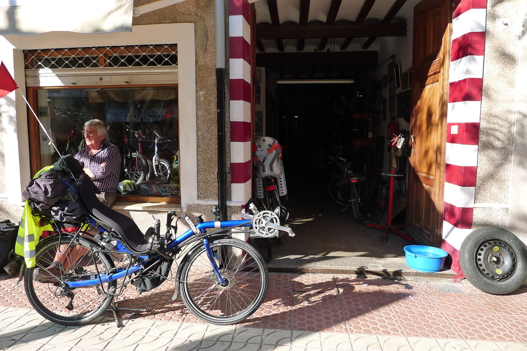 Mais il semble que je suis tombé chez monsieur bricolage de l'Espagne, même si il bricole à coup de marteau, il agit avec méthode et même si je ne comprend pas exactement pourquoi il fait tout ça, au bout d'un moment il a l'air content de lui. On va pour essayer sur le vélo, et là oui, il est content. Moi moyennement, je lui explique que comme ça, la suspension est à l'envers !