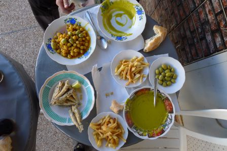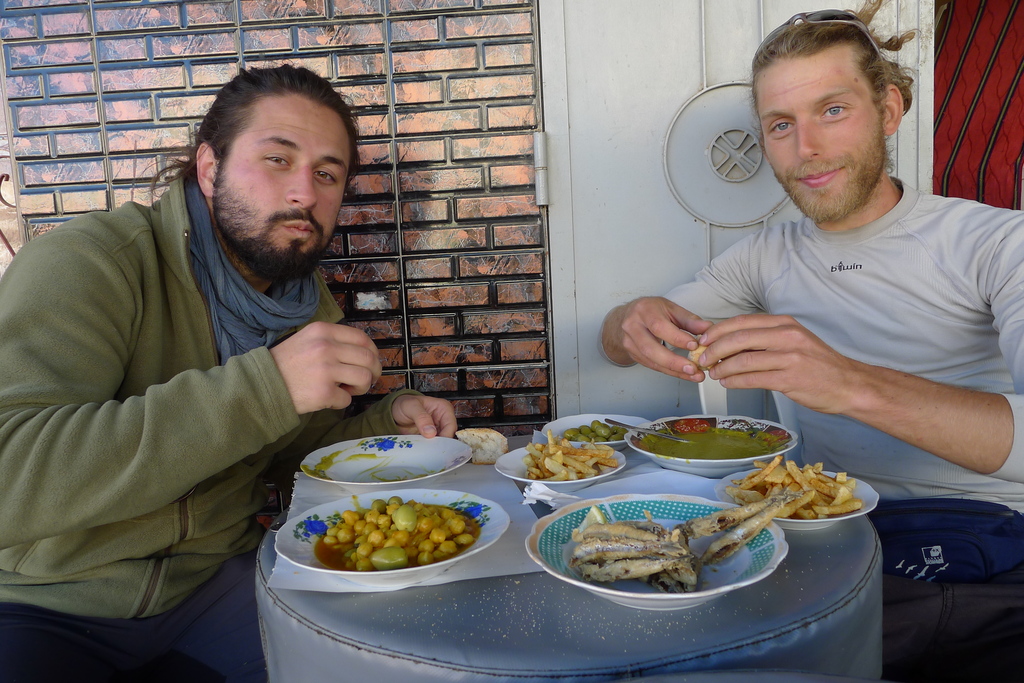 Le soir, vers Midar, on essaye de demander aux gens que l'on croise où trouver un endroit pour dormir. Ici peu de gens parlent le français, c'est l'arabe qui est de rigueur. Julian en connais quelques mots, mais pas de quoi aller bien loin. On rencontre deux Marocains qui parlent un Allemand parfait, Julian aussi, et ils nous aident. Un de leur amis nous prête un appartement dans la maison qu'il est en train de se faire construire. C'est un producteur d'huile d'Olive, du coup il nous offre un litre et demi de la meilleure huile qu'il possède : "celle là, jamais tu ne la trouvera dans un super marché". De quoi bien alourdir nos sacoches ! Le soir, il nous invite au restaurant où l'on dégustera un poulet frite à la marocaine, excellent.