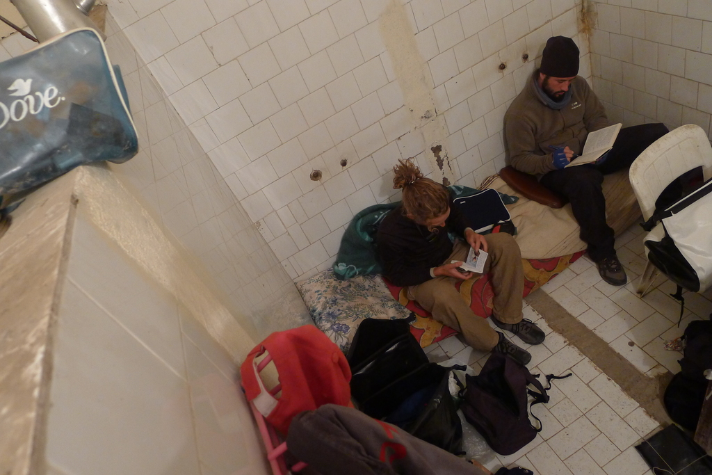 contre, il a un ami à environ 6km qui tient un garage collé à une station Total et qu'on pourrais dormir dedans. On se met donc en route, l'occasion d'utiliser nos phares. Arrivés à la station, on découvre notre lieu de couchage : un endroit qui n'est pas fermé et qui semble servir pour les vidanges des voitures/camions : avec de l'huile sur le sol et une fausse à vidange en pleins milieu. On est pas très exigeants, mais on avait imaginé un peu mieux c'est vrais. On prend un thé à la station pour décider de ce qu'on va faire. On décide de repartir et planter la tente dans un champ d'olivier, mais avant qu'on monte sur les vélos, une personne viens nous voir. Il s'agit en fait du pompiste, il viens de finir sa journée et il nous propose un petit local dans la station où il se repose habituellement, il nous donne même les clés. Du coup, on est vraiment mieux là dedans, on peu y mettre les vélo et même cuisiner des pâtes et surtout dormir au chaud. Ce n'est pas encore ce soir qu'on sortira la tente au Maroc !