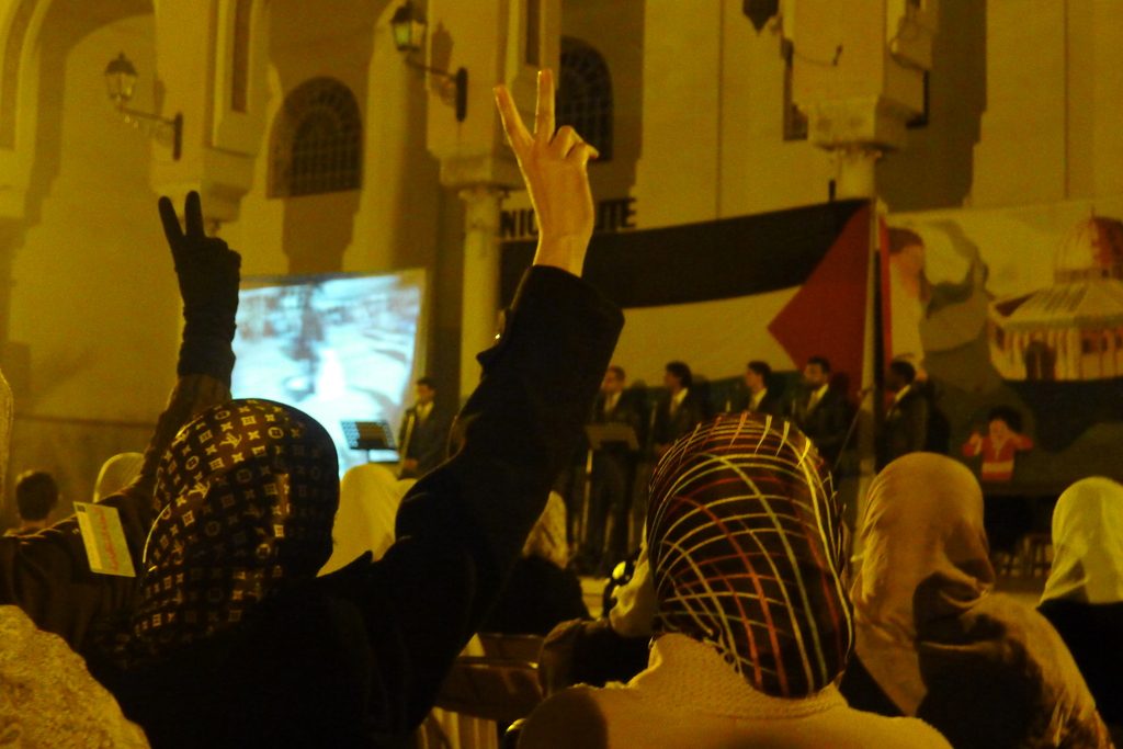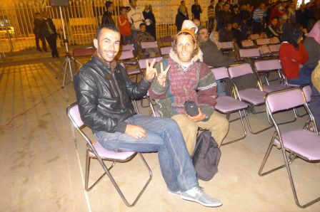 Dans la soirée, il y a une espèce de fête qui semble se passer dehors, on va voir ce que c'est. C'est une manifestation de soutient à la Palestine, on reste un peu et Azdine m'offre une écharpe aux couleurs de la Palestine.
