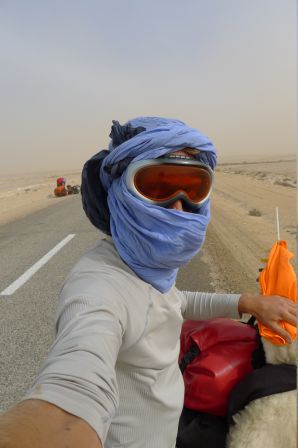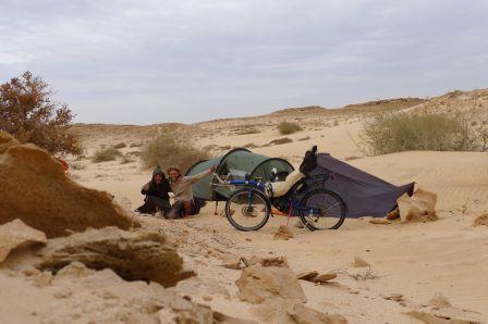 Au premier bivouac, mon matelas se perce sur des épines cachées dans le sable. Dès lors, les nuits sont moins réparatrices et également plus froides (le matelas sert aussi d'isolant thermique). Chaque nuit nous avons droit à de petites tempêtes de sable qui font trembler la tente, heureusement, notre technique est maintenant rodée : les pierres les plus grosses possibles pour assurer les petites sardines qui ne tiennent pas dans le sable et des pelletées de celui-ci tout autour de la tente pour limiter la prise au vent. Le cocktail est efficace et résiste bien. Les bivouacs sont également plus difficile à choisir, en plus d'être à l'abri des regards, on essaye d'être aussi à l'abri du vent (un peu) et si possible de ne pas trop aller dans les zones dites "en cours de déminage" mais dont les panneau sont tellement rouillés que ça doit faire longtemps que c'est "en cours".