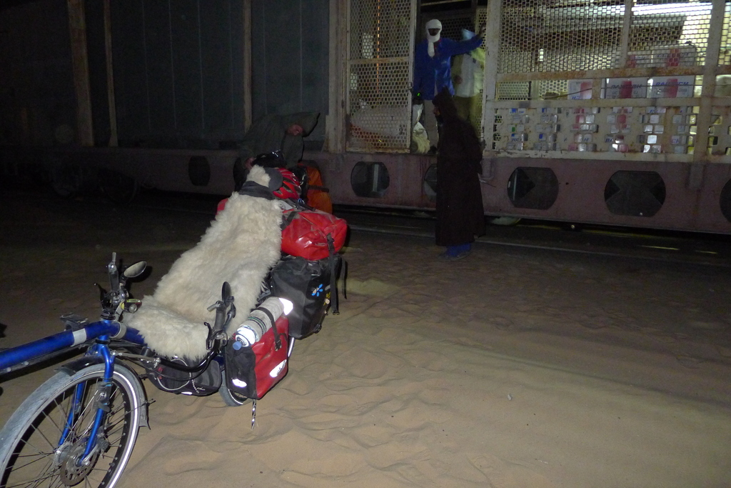Pour prendre ce train, deux options : payer un ticket pour le wagon passagers, mais les portes sont trop étroites pour y faire entrer les vélos. Ou voyager gratuitement dans les wagons minerais où il faut hisser les vélo à 4m de hauteur et où il y a énormément de poussière alors que nous venons tout juste de remettre les vélo à neuf. Je met les 5h de retard du train à profit pour discuter avec les gens de la gare : finalement nous embarquons nous et nos vélo gratuitement dans le wagon de marchandises. Un chemineau qui est dans le même wagon nous offre même du thé pendant le voyage !