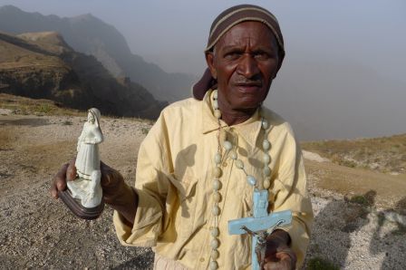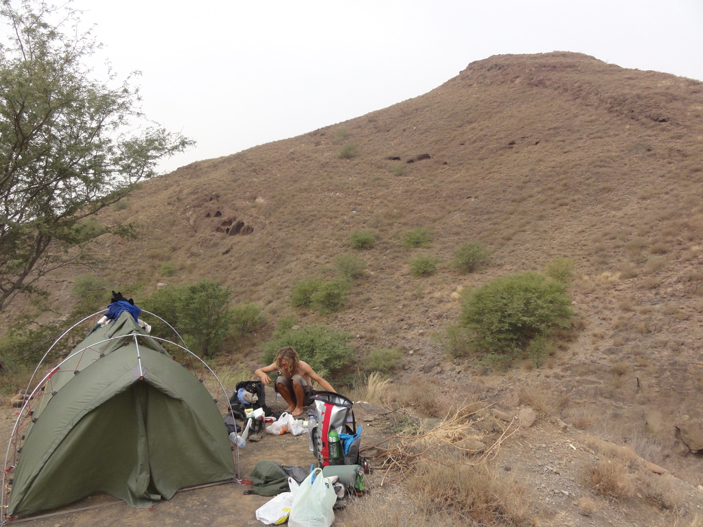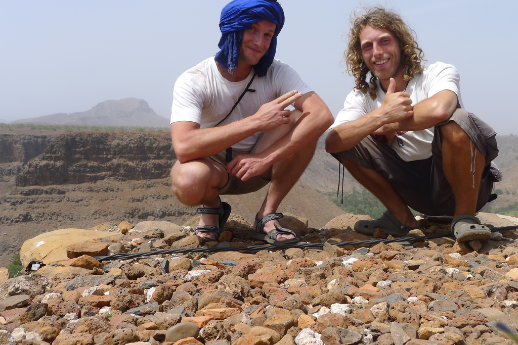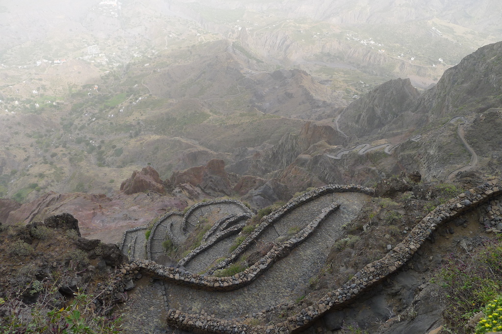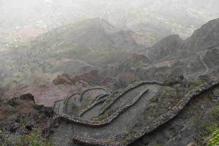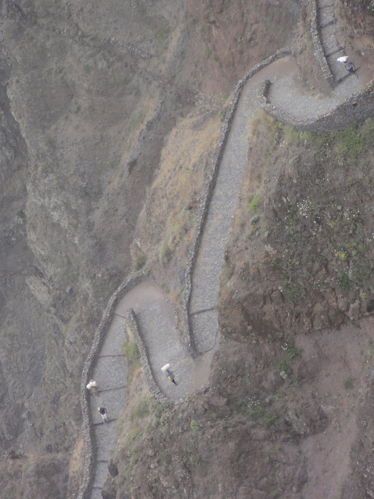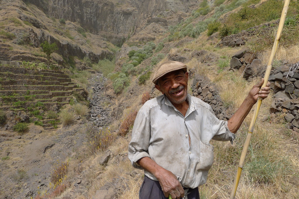 Nous passons les premiers jours dans les montagnes où nous croisons très peu de gens et pas un seul touriste. Notre principale difficulté est de gérer notre eau : avec cette chaleur nous en consommons plus qu'à vélo bien que nous pouvons en transporter moins et nous ne pouvons pas aller très loin pour nous ravitailler, contrairement au vélo. Au bout d'un ou deux jour, on commence à être au point et moins stresser de ce paramètre. On fait la rencontre de Cap Verdiens qui cultivent les flancs de la montagne à l'aide de terrasses. La communication n'est pas aisée, les gens ne parlent que Créole que nous ne parlons pas du tout. L'espagnol ne nous ai pas d'un grand secours, les mains, des bouts de mots et des dessins au sol nous aident. A ce jeu là, Virgile est beaucoup plus patient que moi : je m'énerve un peu de ne pas pouvoir communiquer.